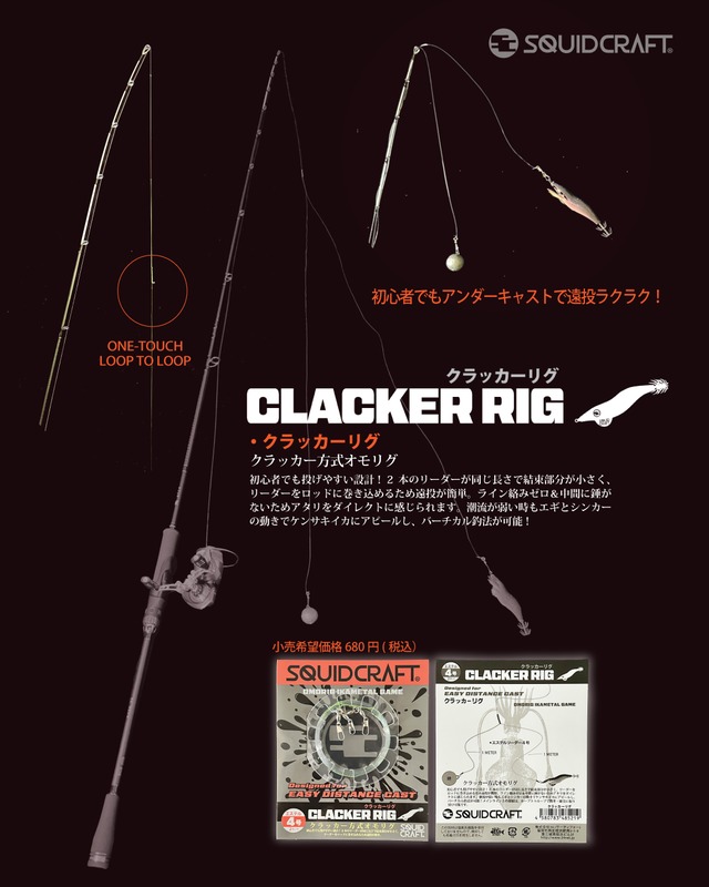 ※注文殺到中商品につき、お一人様3つまででお願いします。 クラッカー方式オモリグ 初心者でも投げやすい設計!2本のリーダーが同じ長さで結束部分が小さく、リーダーをロッドに巻き込めるため遠投が簡単。 ライン絡みゼロ&中間に錘がないためアタリをダイレクトに感じられます。 潮流が弱い時もエギとシンカーの動きでケンサキイカにアピールし、バーチカル釣法が可能! エステル4号(2セット入り)